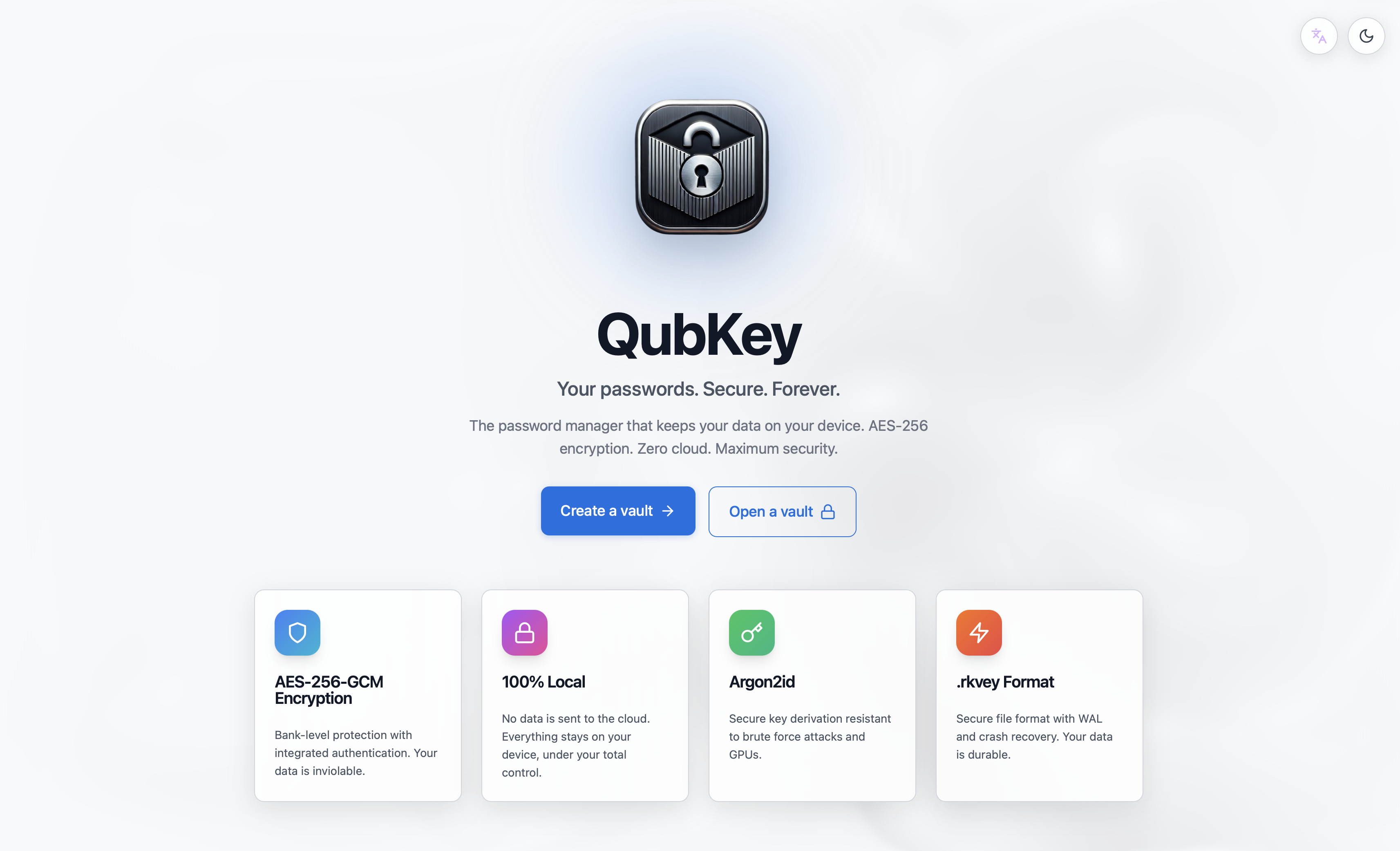 AES-256-GCM and XChaCha20-Poly1305 encryption, Argon2id key derivation with secure parameters, zeroization of sensitive data, .rkvey format with cryptographic signature.