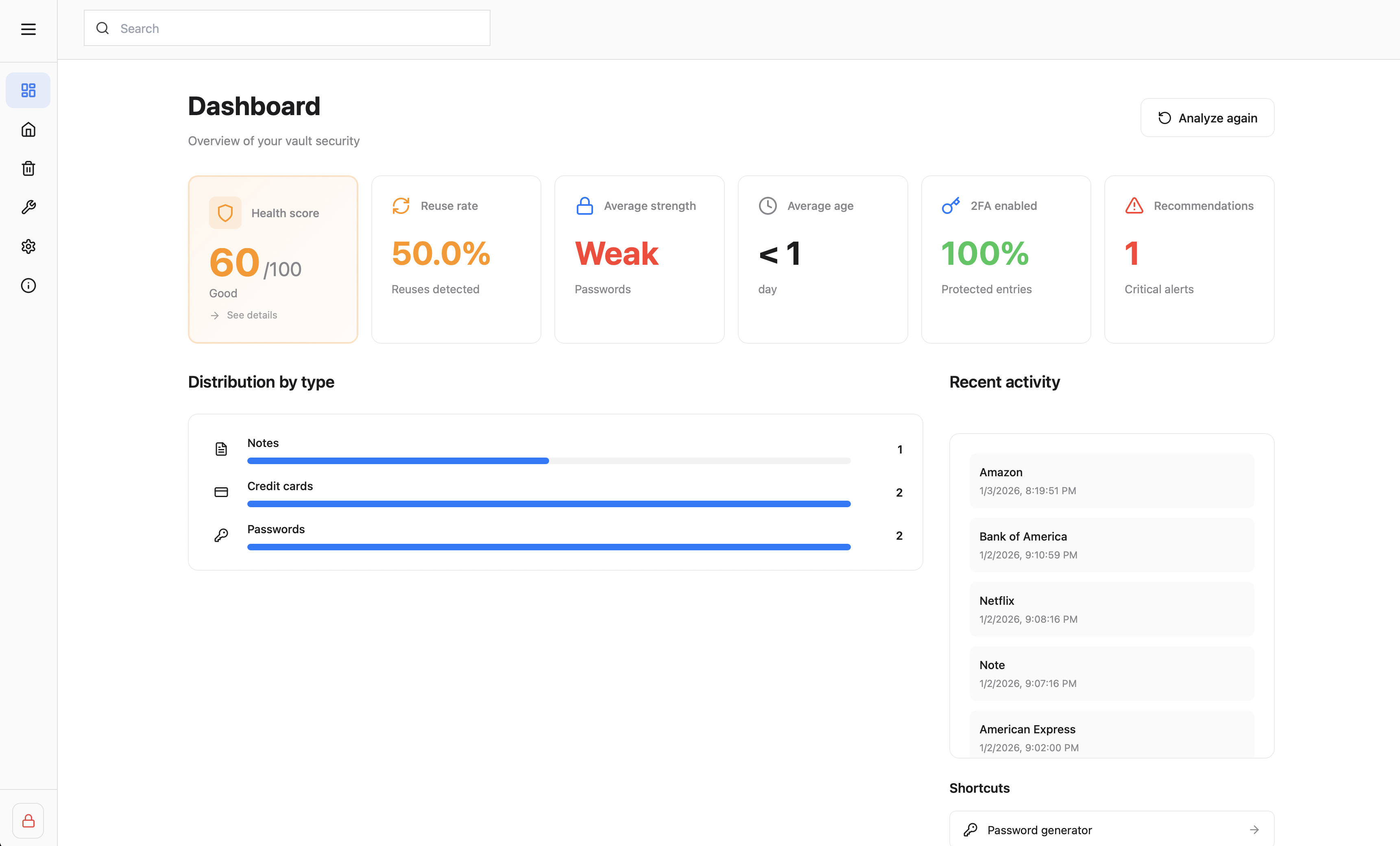 Global health score (0-100) with visualization, real-time metrics (reuse, average strength, average age, 2FA), age histograms, clickable recommendations.