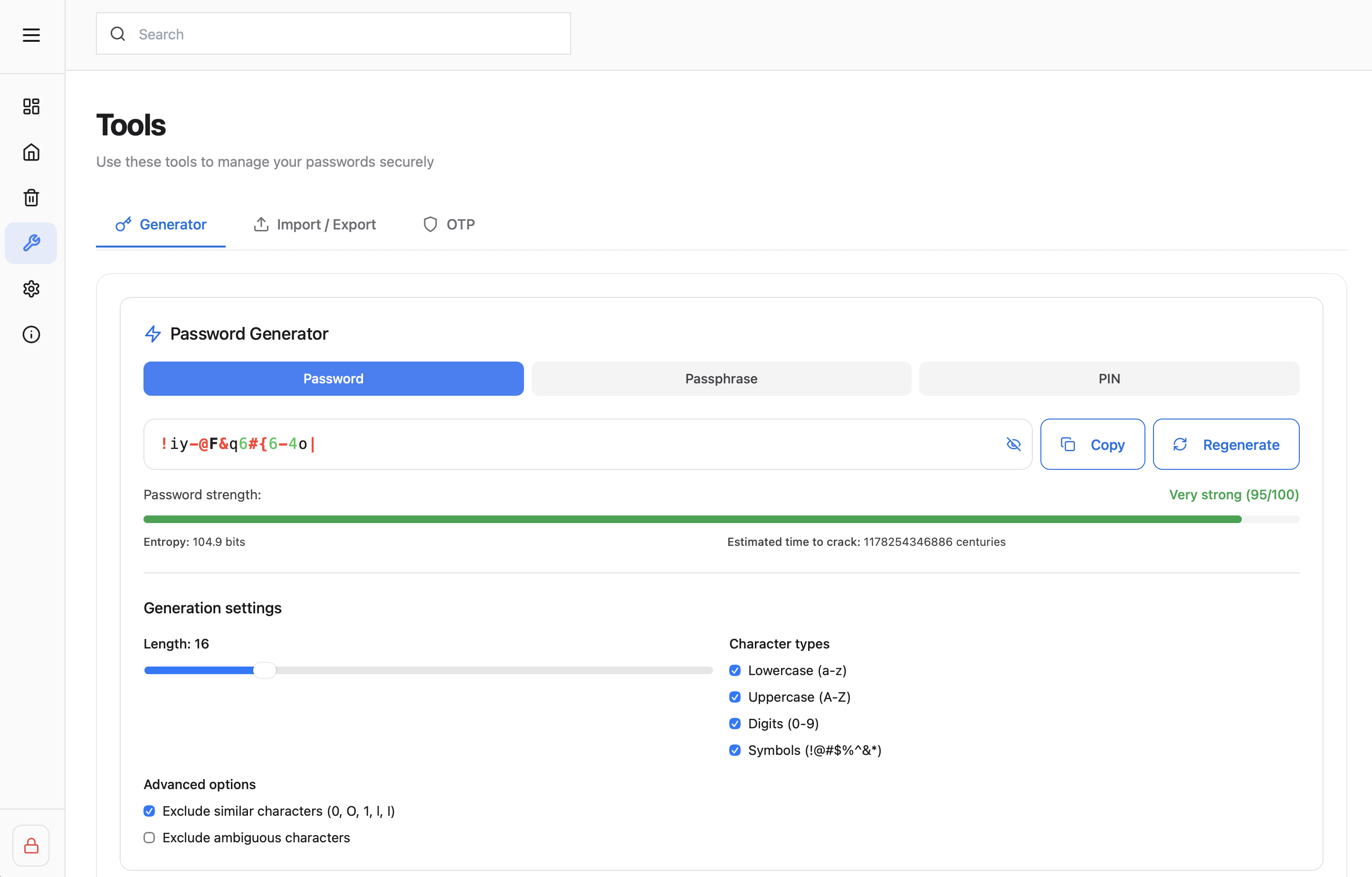 Customizable generator (length, characters) with strength indicator (0-100 score, entropy, crack time). Passphrase generation with WLEX wordlists (6 languages). PIN generation.